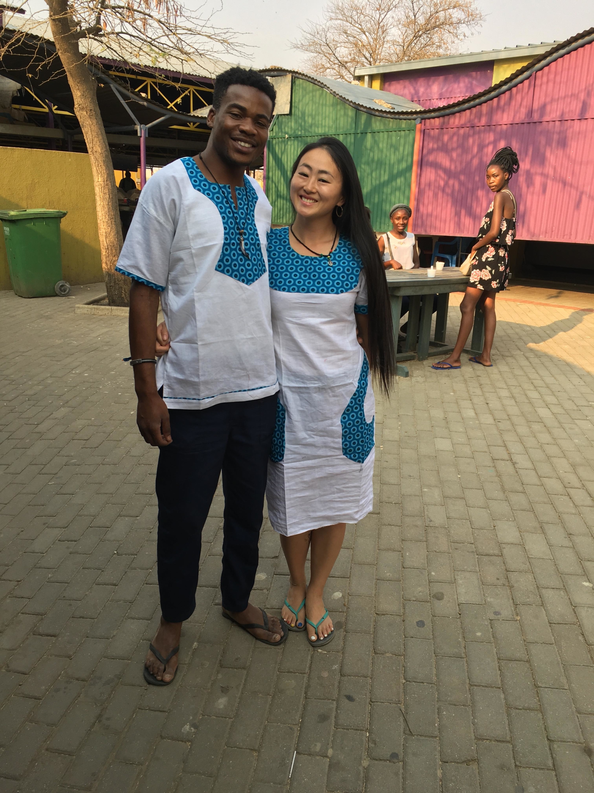 写真:ナミビア人の恋人と南部のアフリカ布衣装を身に纏う