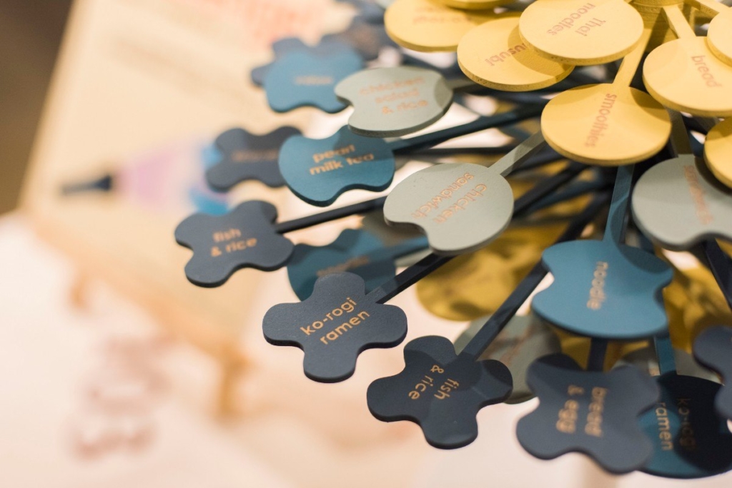 この作品は表面にさまざまな食べ物の名前が書いてあり、ブラックライトを当てると血糖値が上がりやすい食べ物が光る仕組みです。